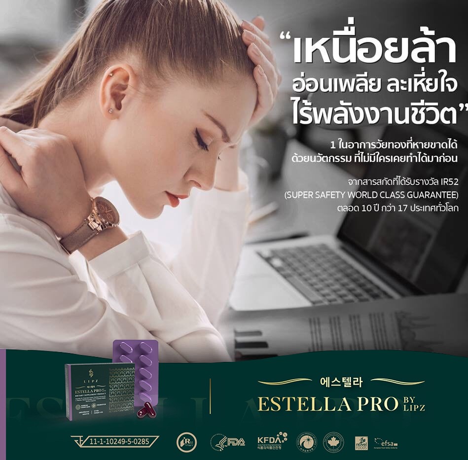 #Estella ใช้สารสิทธิบัตรพิเศษ* ที่ทดแทนฮอร์โมน มีความปลอดภัย การันตีกว่า 10 ปี จาก 17 ประเทศทั่วโลก ลูกค้าทุกคนที่ได้มีโอกาสทาน ## สูตรเห็นผล 1 เดือน ## สมดุลฮอร์โมนเพศหญิง จะดีขึ้น อาการต่างๆ เช่น การนอนไม่หลับ ร้อนวูบวาบ หงุดหงิด ประจำเดือนที่มาบ้าง ไม่มาบ้าง จะค่อยๆดีขึ้น ##อย่างมีนัยสำคัญ |