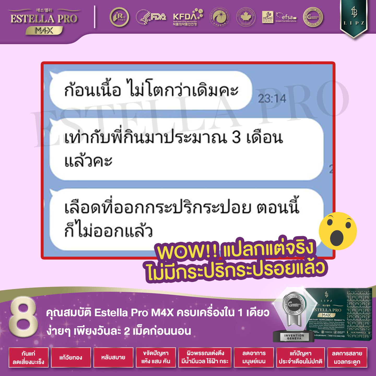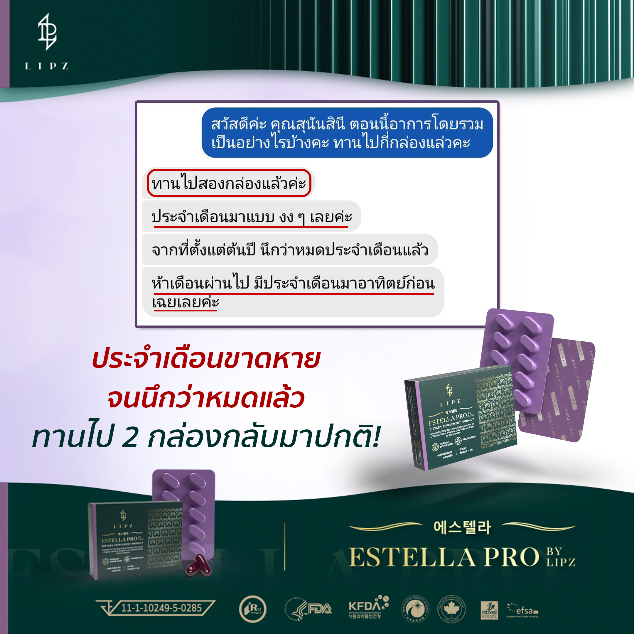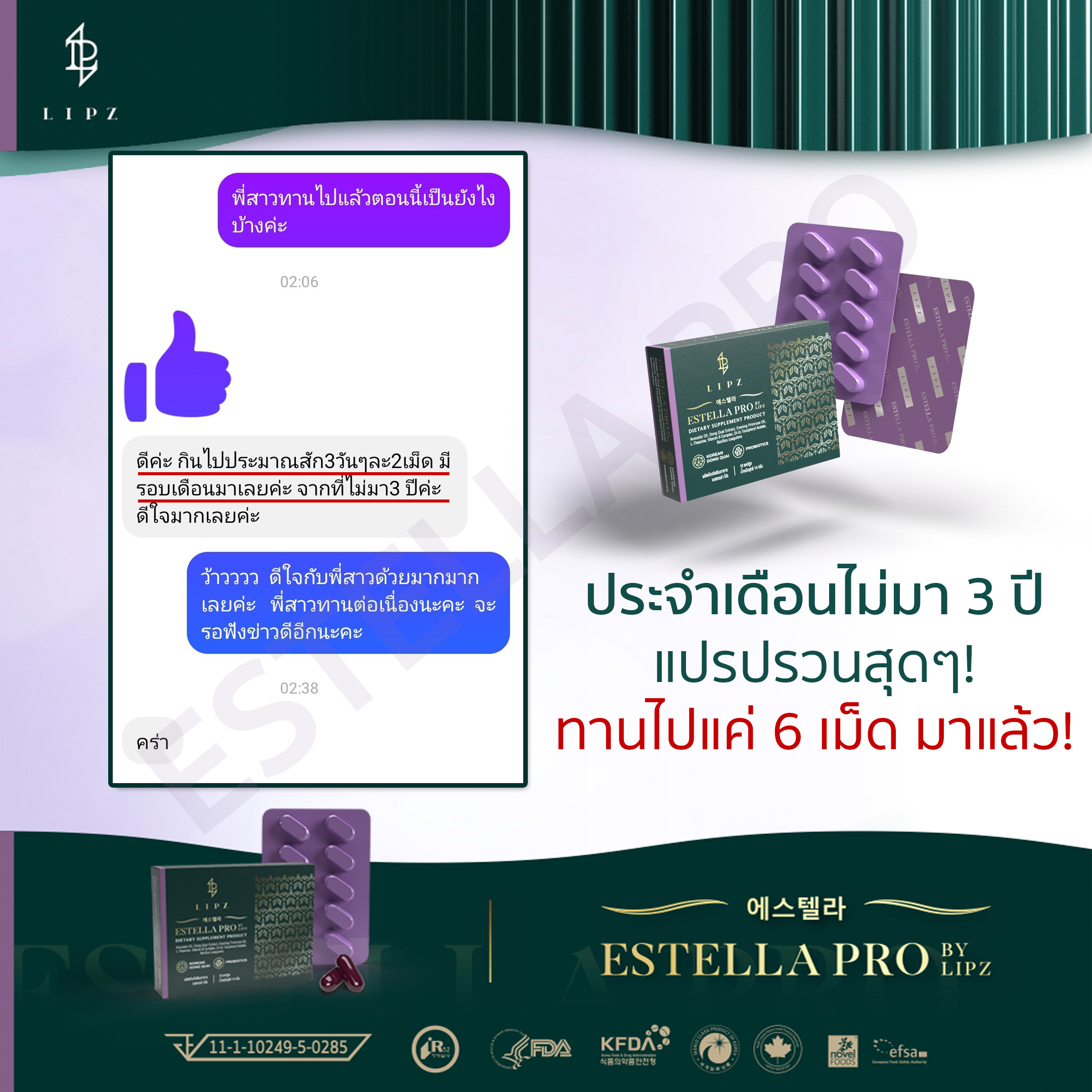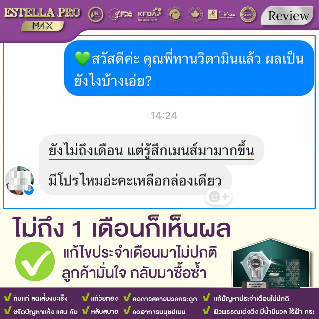 🏆#Estella ใช้สารสิทธิบัตรพิเศษ* ที่ทดแทนฮอร์โมน มีความปลอดภัย มีการใช้มากว่า 10 ปี จาก 17 ประเทศทั่วโลก ลูกค้าทุกคนที่ได้มีโอกาสทาน ## สูตรเห็นผล 1 เดือน ## อาการวัยทอง 10 ประการ ลดลงอย่างเห็นได้ชัด ผลลัพธ์เรื่องประจำเดือน ดีขึ้นอย่างชัดเจน . |